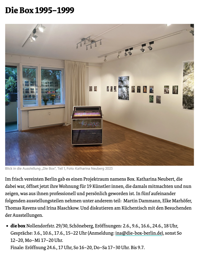 Mich hat an dem time warp interessiert was aus der gefühlten Freiheit geworden ist, die ich bzw. „wir“ in den 1990ern in Berlin spürten. Ich habe aus dieser Zeit viel mitgenommen und blicke gerne zurück in die Offenheit, die Unbestimmtheit des städtischen Raumes und die gleichzeitige Ernsthaftigkeit, den Spaß und die Intensität in der Auseinandersetzung mit der Kunst und im Miteinander damals. Dafür war „die box“ ein Ort.
