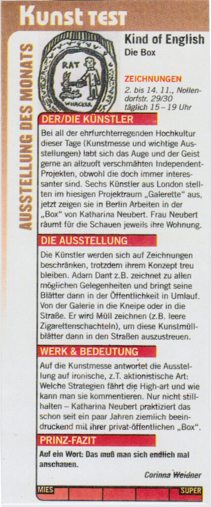 Bei meiner ersten Ausstellung in der box in 1996 hatte ich den Versuch gewagt mit einer raumgreifenden, begehbaren Installation dagegen anzuarbeiten und den Raum zu miniaturisieren. – Ohne Erfolg! Mal sehen, ob es beim nächsten Mal gelingt.